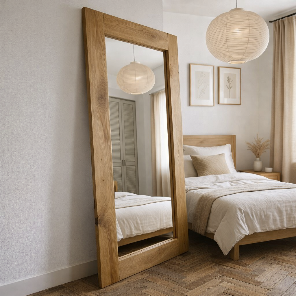Lustro w ramie z naturalnego drewna dębowego, wykonane w minimalistycznej, surowej stylistyce. Idealne do wnętrz urządzonych w stylu loft, skandynawskim, rustykalnym i japandi. Duży format i solidna rama czynią z niego zarówno praktyczny element wyposażenia, jak i efektowną dekorację.